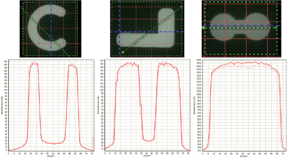 The red color channel was used for the analysis of irradiated test film as it had the largest dynamic range. Absolute dose gamma analysis results can be seen in Table 5. Visual inspection of the gamma distribution (Figure 10) revealed majority of in‐field points agreeing to within 3% with larger differences on the edges of the fields. Sample dose profiles (Figure 11) showed good qualitative agreement within 5 cGy (3%) despite the noise present in the profiles.