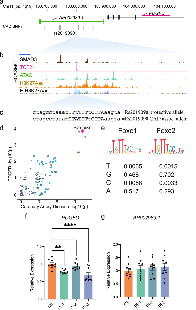 Our group previously identified 87 candidate genetic variants that are associated with CAD, using human coronary artery smooth muscle cell (HCASMC) ATAC-seq and ChIP-seq data with CARDIoGRAMplusC4D CAD GWAS variants30. After filtering for variants with a combination of known and predicted regulatory elements in the intergenic regions and evidence of transcription factor binding in vivo, we prioritized 64 variants in HCASMC. Six CAD SNPs in high linkage disequilibrium were noted to be associated to CAD risk by GWAS at 11q23.2. One of these SNPs, rs2019090, was localized 150 kilobases (kb) downstream of PDGFD in an intron of the long non-coding RNA (lncRNA) AP002989.1, in HCASMC peaks for ATAC-seq identified open chromatin and enhancer related H3K27ac histone modification, in juxtaposition to ChIP-seq peaks for CAD transcription factors (TFs) TCF21 and SMAD3 (Fig. 1a–c). GWAS data curated in the NHGRI-EBI GWAS Catalog (V1.0.2) also indicated association with carotid intimal-medial thickness (IMT), with the A allele identified as promoting disease risk for both CAD and IMT31–34. Rs2019090 was shown to serve as an expression quantitative trait locus (eQTL) variant in analysis of GTEx data (p = 1.6e−8), with the risk ‘A’ allele being associated with greater expression of PDGFD5,32,35,36, as well as increased expression of AP002989.1 in an early GTEx analysis of aortic tissue (p = 3.72e−5)37. In addition, this variant was identified with GTEx data as a splicing QTL (sQTL) for AP002989.1 (p = 4.1e−8). Further, mapping of recent CAD GWAS association findings to vascular eQTL data using the locuscompare.com visualization tool (locuscompare.com) suggested that rs2019090 provides the greatest contribution to CAD risk and PDGFD expression (Fig. 1d and Supplementary Fig. 1a). This was validated with the enloc fine mapping and genome-wide co-localization analysis algorithm38. This tool implements a Bayesian hierarchical model with summary level data to provide a rigorous statistical evaluation of related genome-wide traits, and for these studies identified a significant relationship between CAD GWAS meta-analysis summary level data and GTEx vascular tissue eQTL data (Supplementary Fig. 1b). PDGFD was identified as significant with a regional level colocalization probability (RCP) of 0.2 as the recommended cutoff to select significant colocalization between the GWAS and eQTL data39.