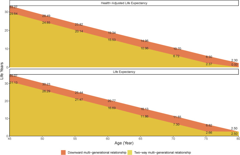 Figure 4 shows the healthy life expectancy and life expectancy for populations with different multi-generational relationships. Healthy life expectancy at age 45 was 33.27 years (95% CIs: 33.20, 33.34) and 29.64 years (29.58, 29.70) in downward multi-generational relationship and two-way multi-generational relationship, respectively. The life expectancy at age 45 was 35.07 years (35.00, 35.14) and 31.13 years (31.07, 31.20) in downward multi-generational relationship and two-way multi-generational relationship, respectively. Compared with two-way multi-generational relationship, downward multi-generational relationship had a higher healthy life expectancy and life expectancy for all ages.