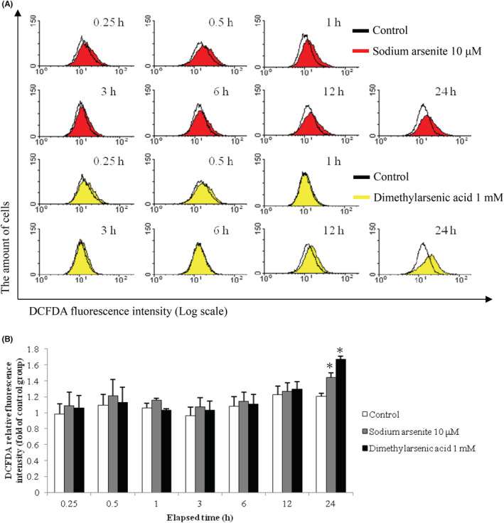 Sodium arsenite and dimethylarsenic acid modulated ROS generation in MA‐10 cells. MA‐10 cells were challenged with sodium arsenite (0 and 10 μM) or dimethylarsenic acid (0 and 1 mM) for 0.25, 0.5, 1, 3, 6, 12, and 24 h, respectively, and stained with DCFDA for 5 min prior to treatment time. Fluorescence was examined by flow cytometry and histograms represent DCFDA fluorescence intensity on a log scale (A). The quantification of ROS fluorescence intensity was normalized by control groups (B). Data in B represent mean ± SEM of 3 independent experiments. The * and ** represent statistical difference as compared to control group at p < 0.05 and p < 0.01, respectively.