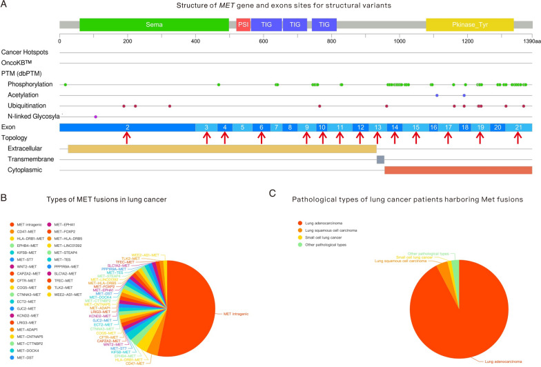 Fusion sites and types of MET fusions in selected lung cancer patients. A MET gene structure and exons that participate in the fusion. B Types of MET fusions in lung cancer patients. C Pathological types of patients harboring MET fusions