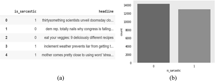Data acquisition is the first step in machine and deep learning and usually involves spending lots of time and resources on gathering data that may or may not be relevant. Two datasets are needed in the proposed framework: a sentiment dataset and a sarcasm dataset. In this paper, the dataset used is obtained from Kaggle. The sentiment analysis dataset [27], which is extracted from Twitter, contains 227,599 tweets labeled as 0 for neutral, 1 for negative sentiment, and 2 for positive sentiment. In order to have a better understanding of the dataset, some sample headers are shown Fig. 2a, and the distribution is given in Fig. 2b. It is important to note that the dataset is slightly unbalanced, with the neutral label being the majority and the negative one being the minority. As for the sarcasm dataset [28], there are 28,619 tweets labeled with 0 for not sarcastic and 1 for sarcastic. Figure 3a shows some samples of the sarcastic and not sarcastic headers of tweets. Similarly, the dataset is slightly unbalanced, with more tweets that are not sarcastic (type 0) in Fig. 3b.