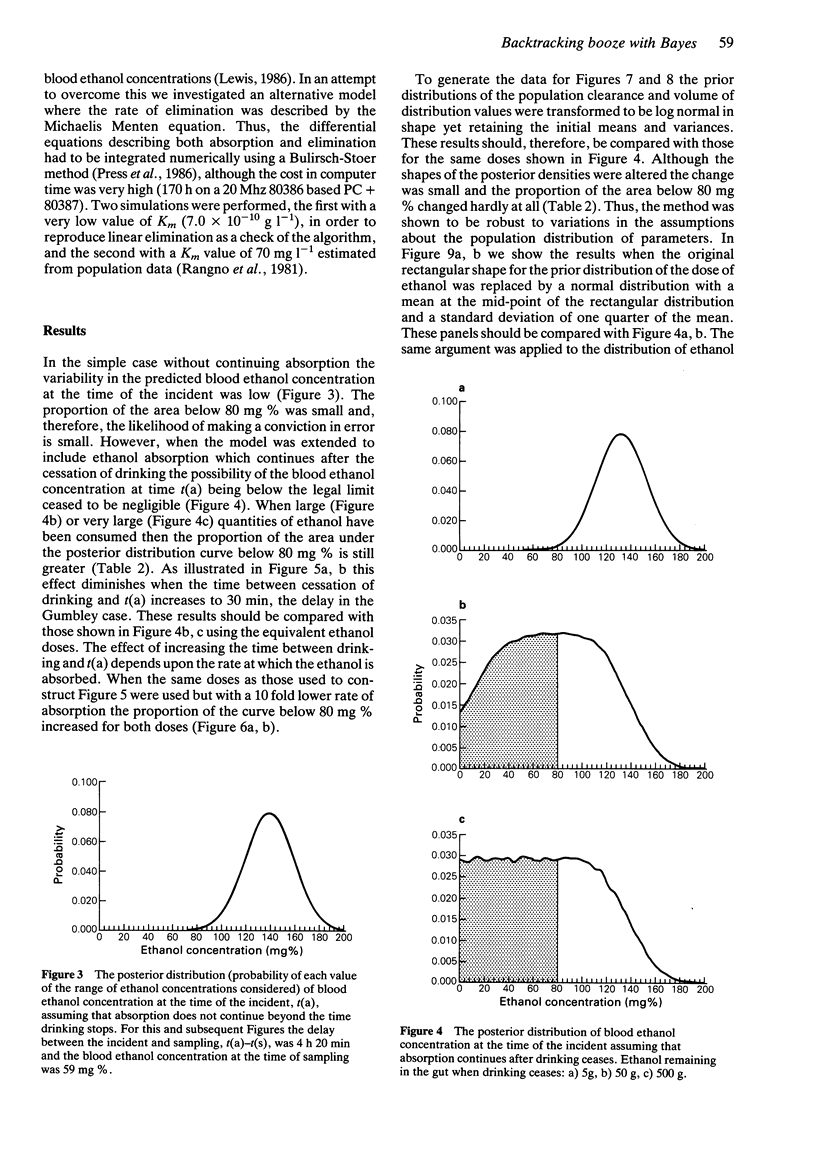 1. A Bayesian method is described which allows the explicit estimation of errors produced in estimating drug concentrations at times for which samples are not available for analysis. 2. This method was applied to the problem of 'backtracking' alcohol concentrations for medico-legal purposes. 3. Computer simulation allowed the effect of continuing alcohol absorption on the position and range of estimates of alcohol concentrations to be studied.